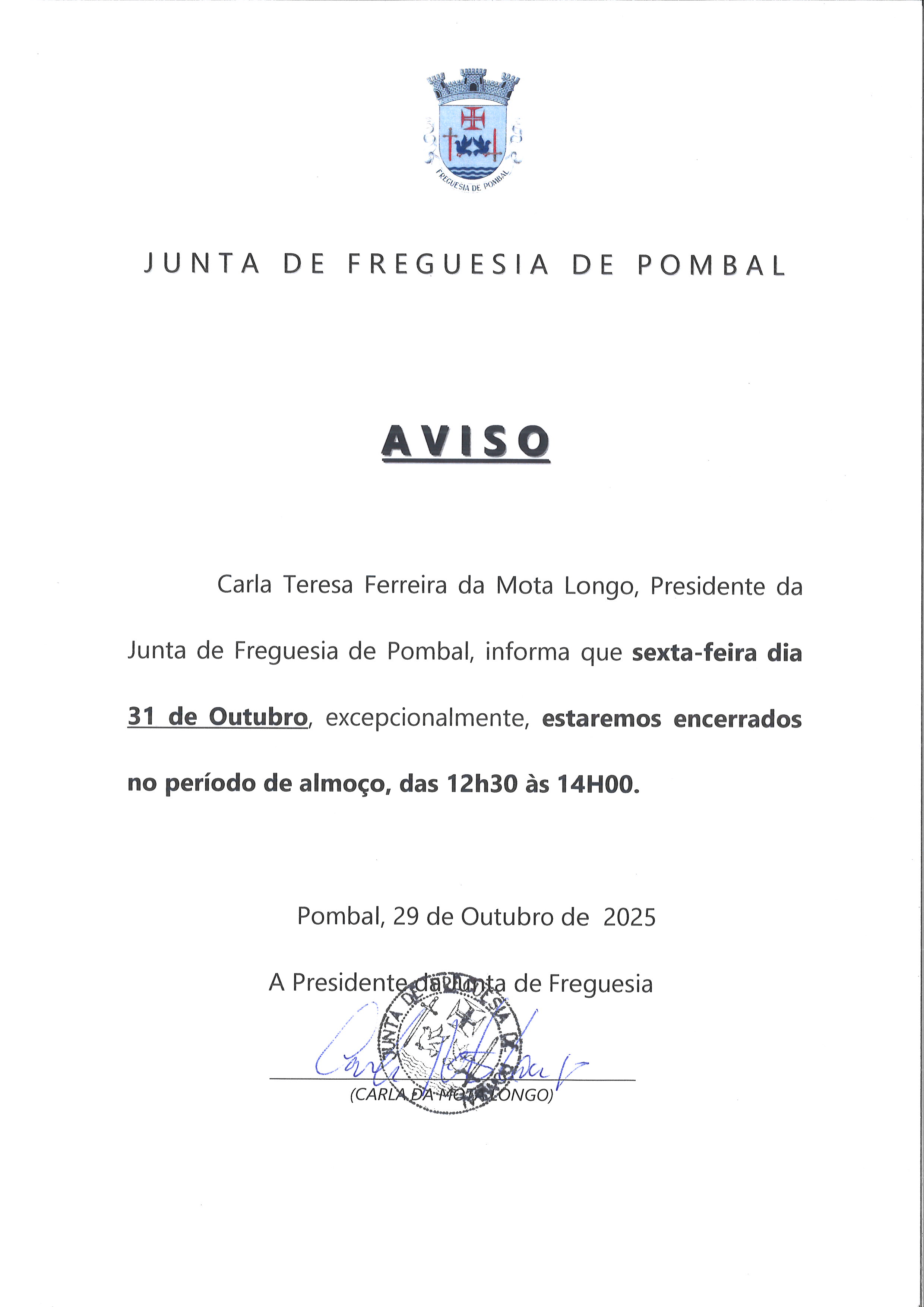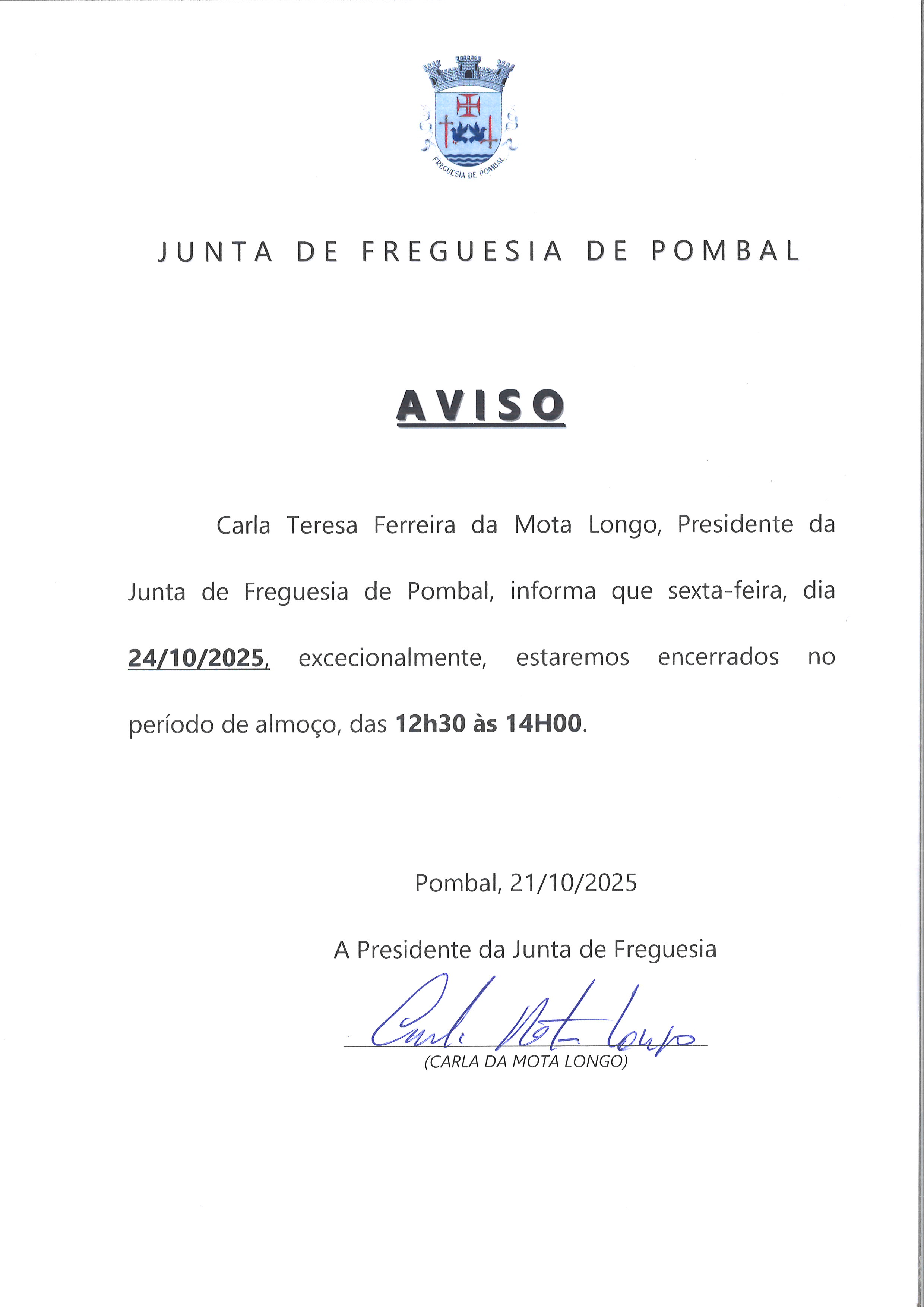 NELSON CORDEIRO PEDROSA, Presidente da Mesa da Assembleia de Freguesia de Pombal, Município de Pombal, torna público, em conformidade com o disposto no n.º 3 do art.º 49.º da Lei nº 75/2013, de 12 de setembro, que irá realizar-se uma Sessão Ordinária no próximo dia 11 de setembro de 2025 (quinta-feira), pelas 21:30 horas, na sede de Freguesia de Pombal, com a seguinte Ordem de Trabalhos: