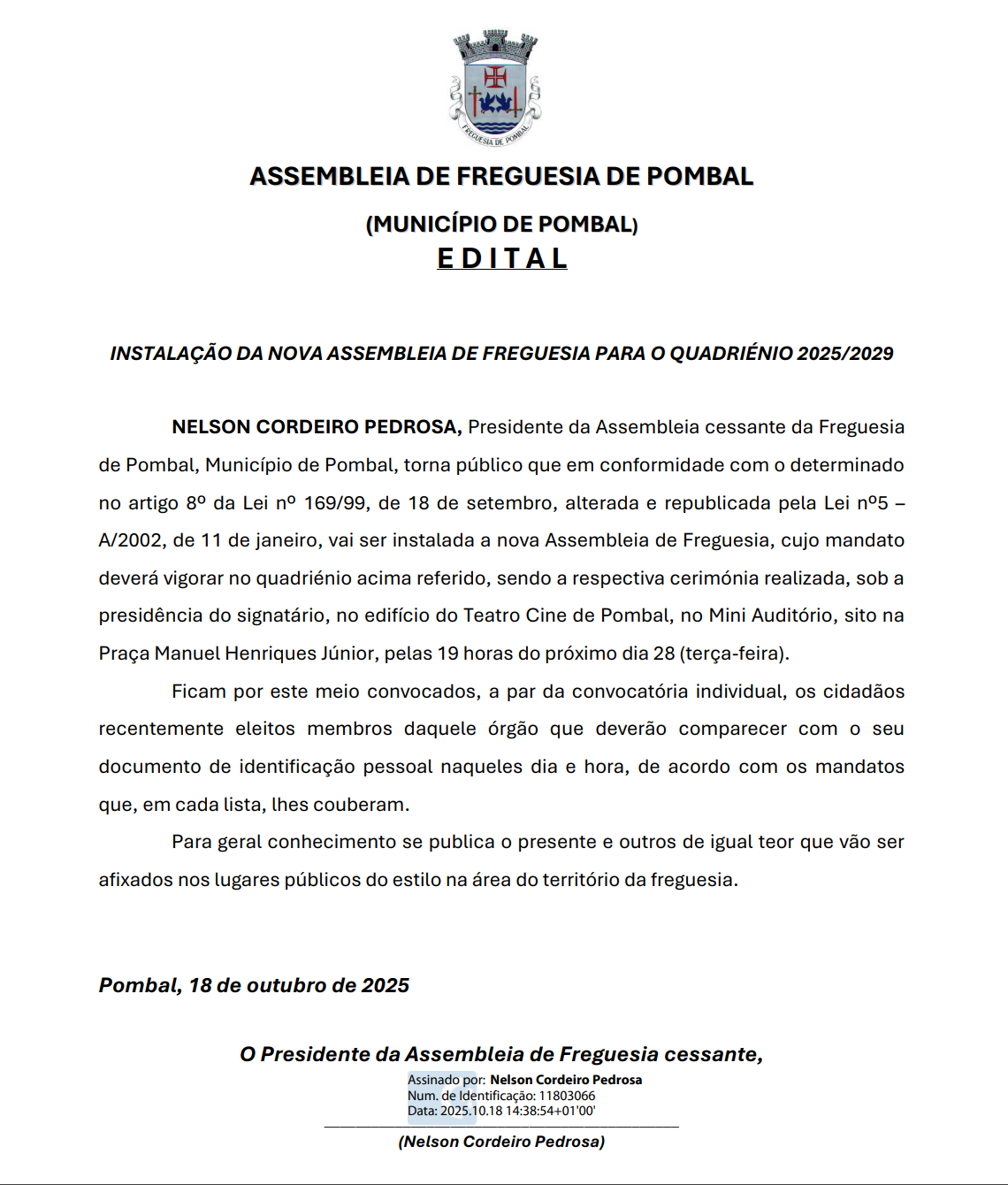 Edital Instalação Assembleia de Freguesia de Pombal para o quadriénio 2025/2029 – 28 Outubro 2025 aqui