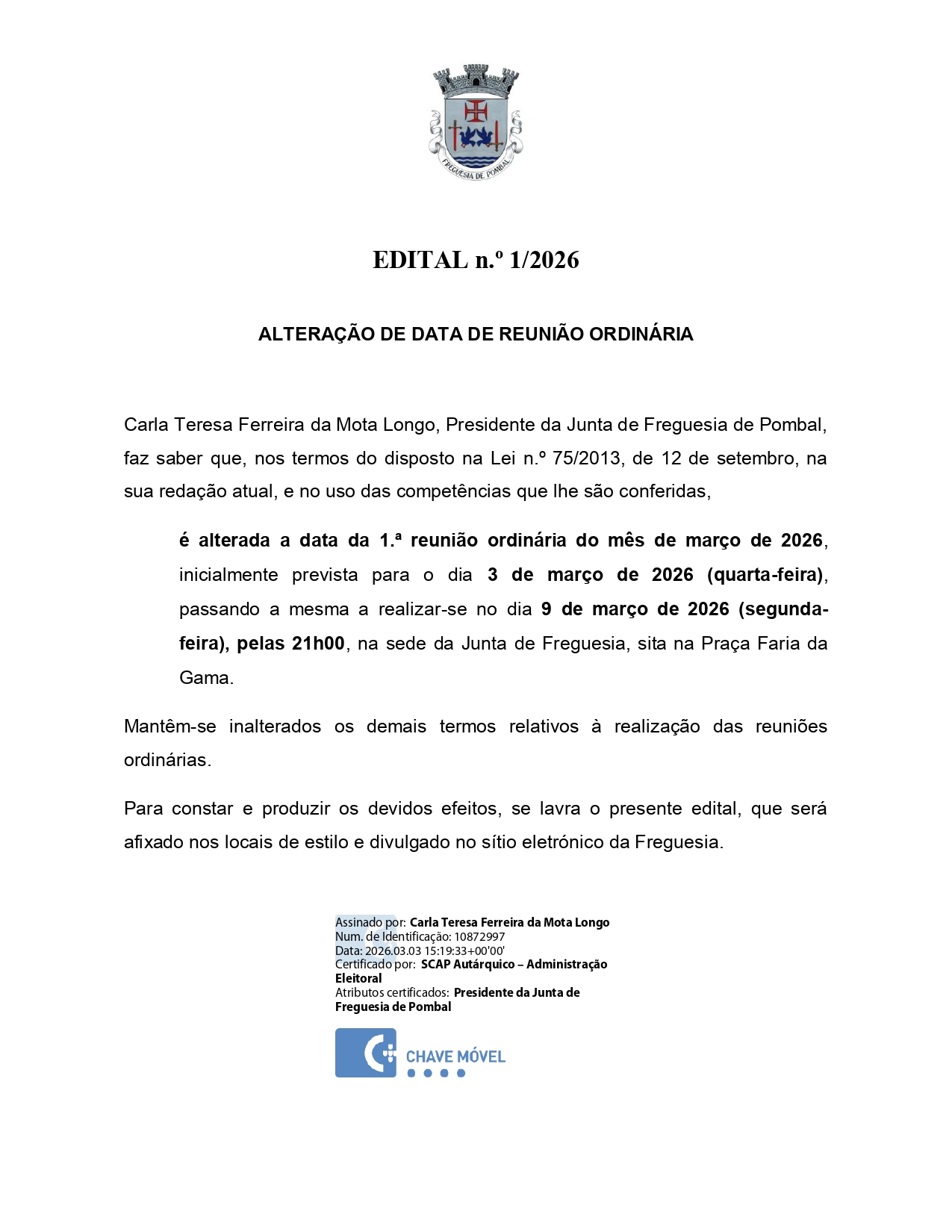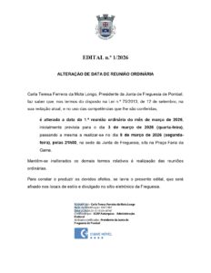 Edital Alteração de Data de Reunião Ordinária da Junta de Freguesia 4 Março, 2026/0 Comentários/em Agenda / Eventos, Atualidade, Editais /por Helena Pedrosa