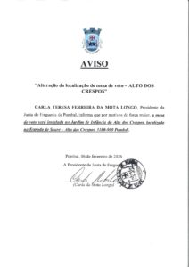 Eleições Presidenciais – Alteração de Localização de Mesa de Voto – Alto dos Crespos 6 Fevereiro, 2026/0 Comentários/em Agenda / Eventos, Atualidade, Editais /por Helena Pedrosa